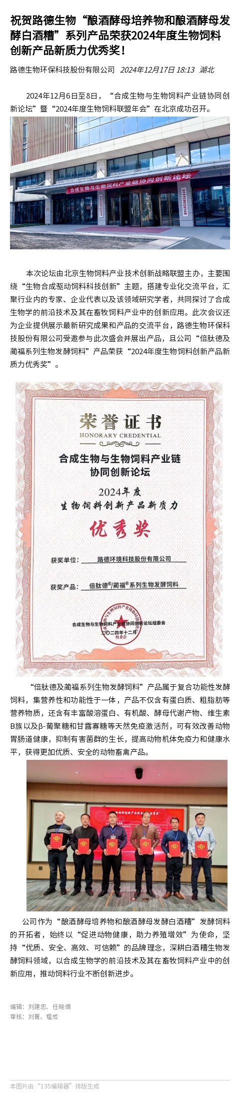 【路德·喜報】祝賀路德生物“釀酒酵母培養(yǎng)物和釀酒酵母發(fā)酵白酒糟”系列產(chǎn)品榮獲2024年度生物飼料創(chuàng)新產(chǎn)品新質力優(yōu)秀獎!